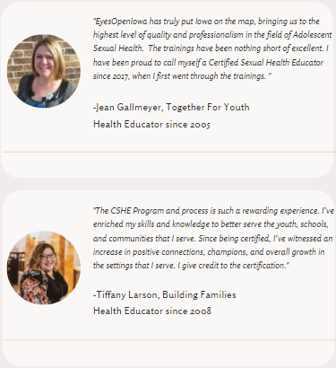 Professional growth is a rewarding process for employers and employees alike. We know you have options when it comes to professional development, so we strive to provide the highest quality certification to benefit organizations, staff, and the students being served. Whether you work in healthcare, education, social work, or prevention services, a Certified Sexual Health Educator credential from EyesOpenIowa can give you the skills and confidence to facilitate meaningful adolescent sexual health education.